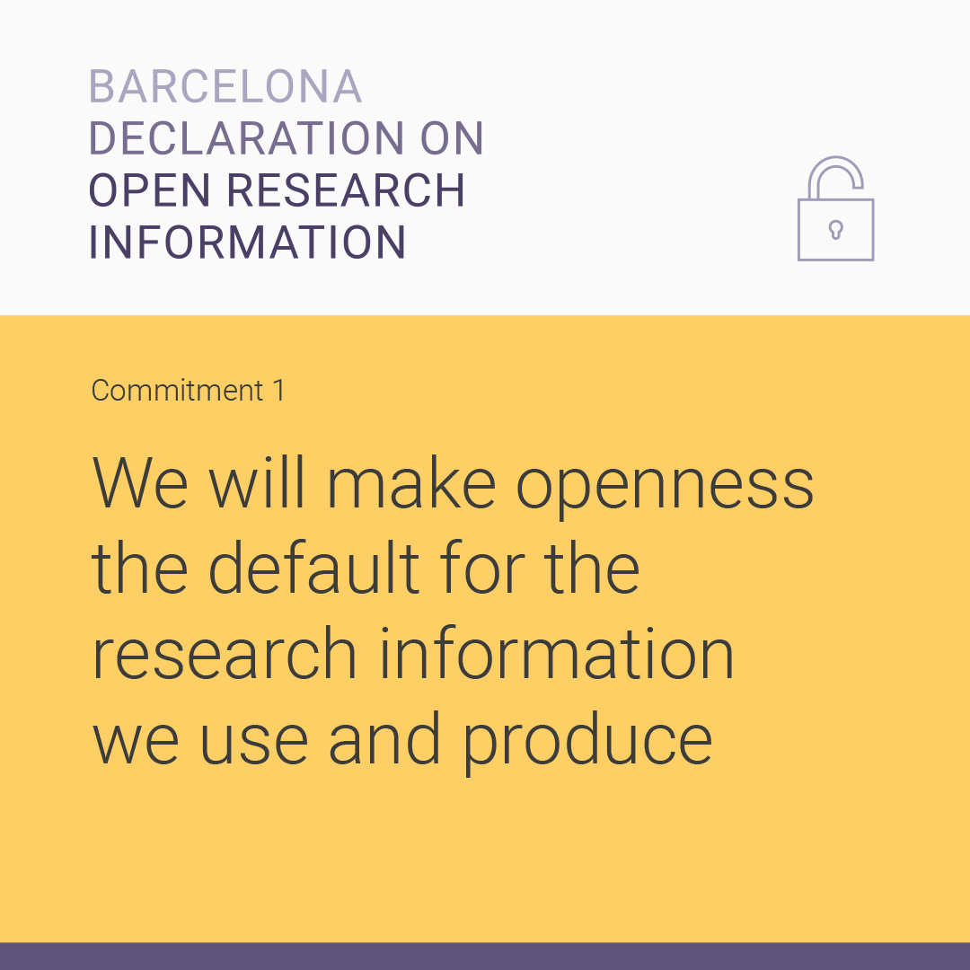 An image containing commitment one: We will make openness the default for the research information we use and produceAn image containing commitment two: We will work with services and systems that support and enable open research information